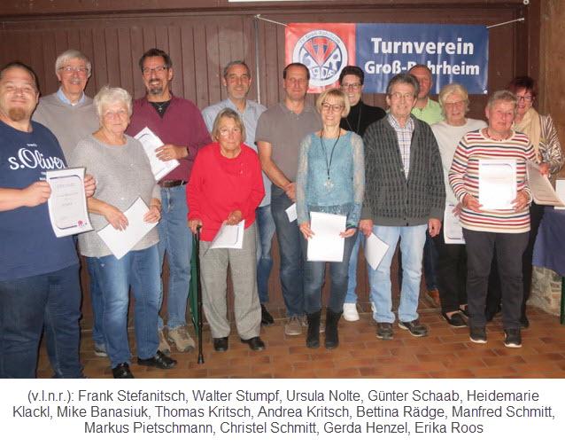 Vorstand mit Abteilungsleiter und geehrten Mitglieder. Von links nach rechts stehend: Andreas Fries, Kai Lorenz, Kurt Janku, Elfriede Janku, Manuael Hegemann, Eva Kratzke, Markus Pietschmann, Pia Strubel, Andrea Kautzmann, Karl Hofmann, Hans-Peter Erlemann, Simone Fieser, Thomas Fox. Sitzend: Elsbeth Schaab, Petra Baach, Liesel Lorenz, Ingeborg Hamm, Karl-Heinz Kraft.